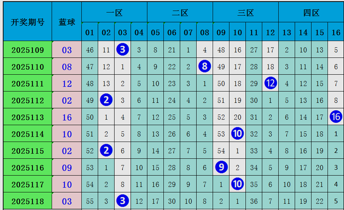 上期蓝球开出号码03,近十期蓝球在一区开4枚,二区开出号码1枚,三区开出4枚,四区开出1枚,区间比4:1:4:1,本期推选蓝球出咫尺一区,重心海涵01。